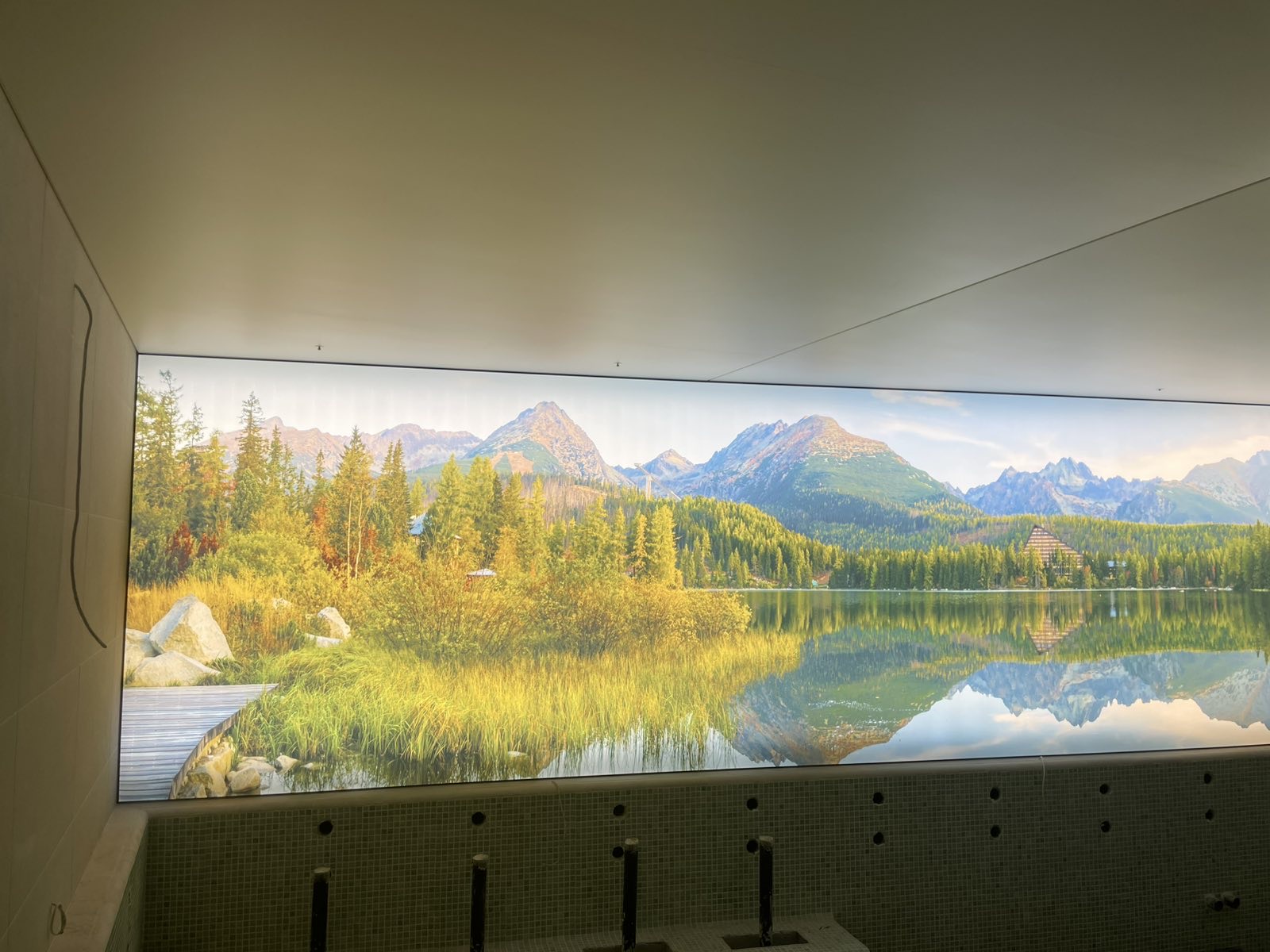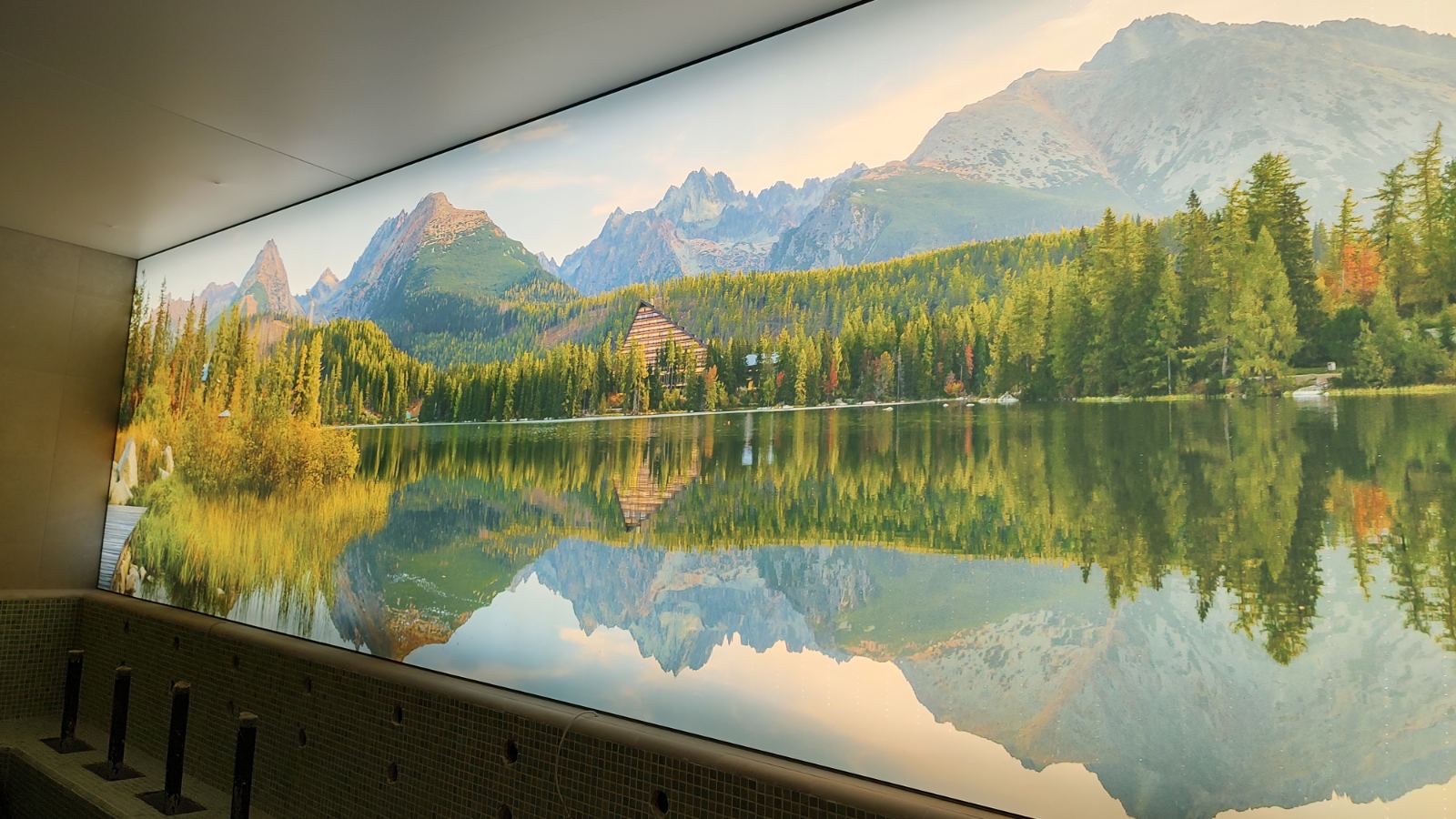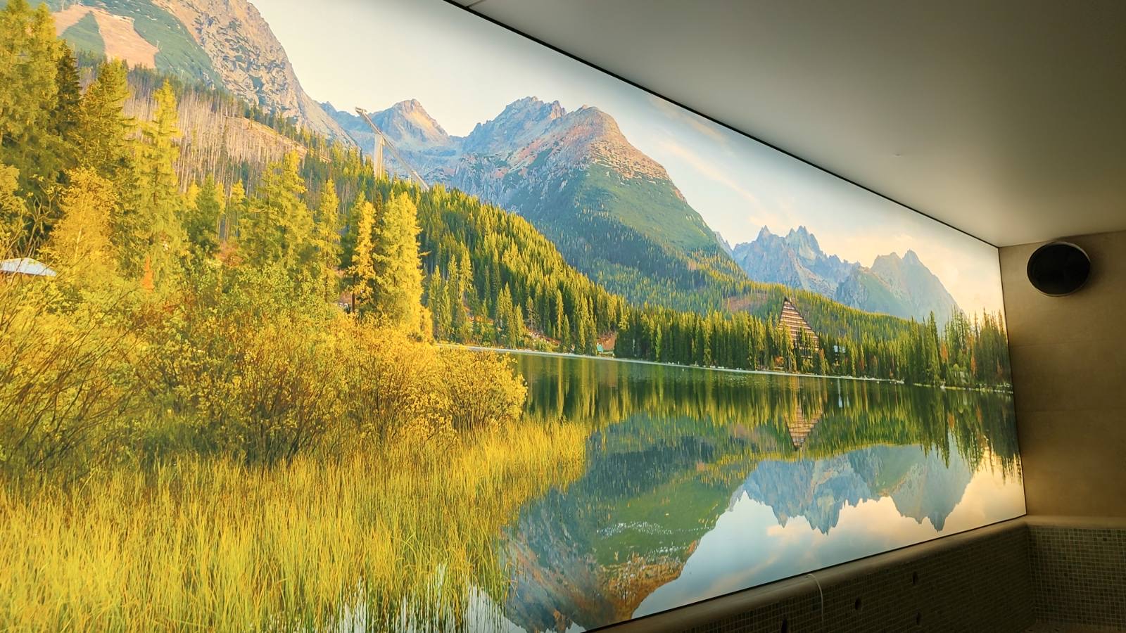 18.Ноем.2025Планинска гледка пресъздадена чрез печат върху транслуцентно акустично платно Барисол, монтирано на стена. Можте да се насладите и лично като посетите хотел Рай в Огняново.