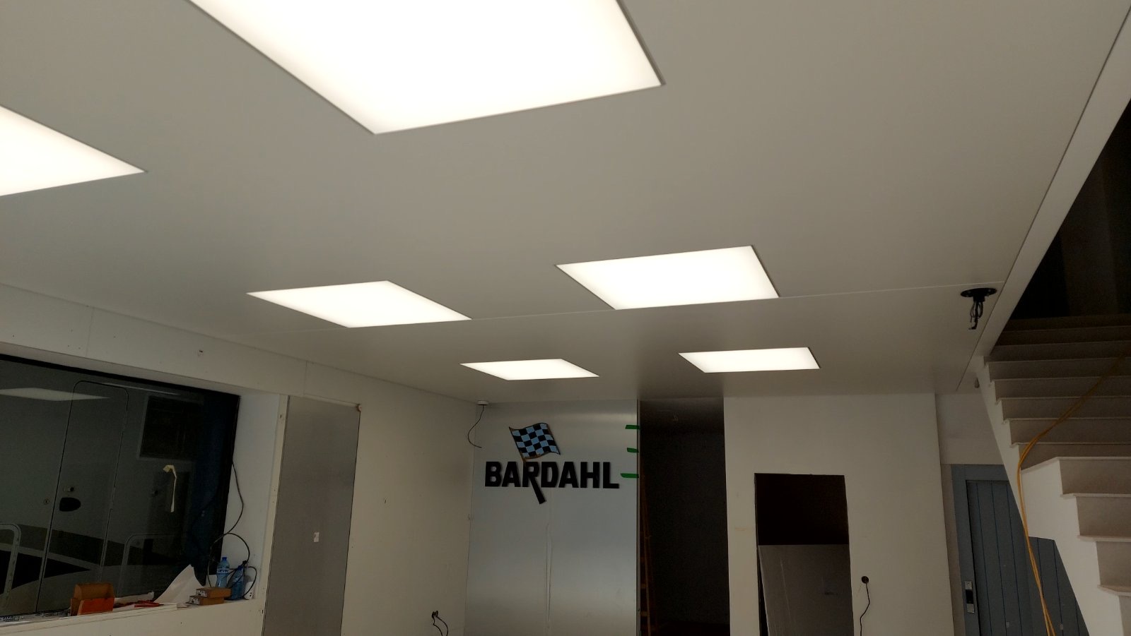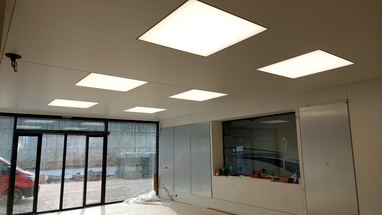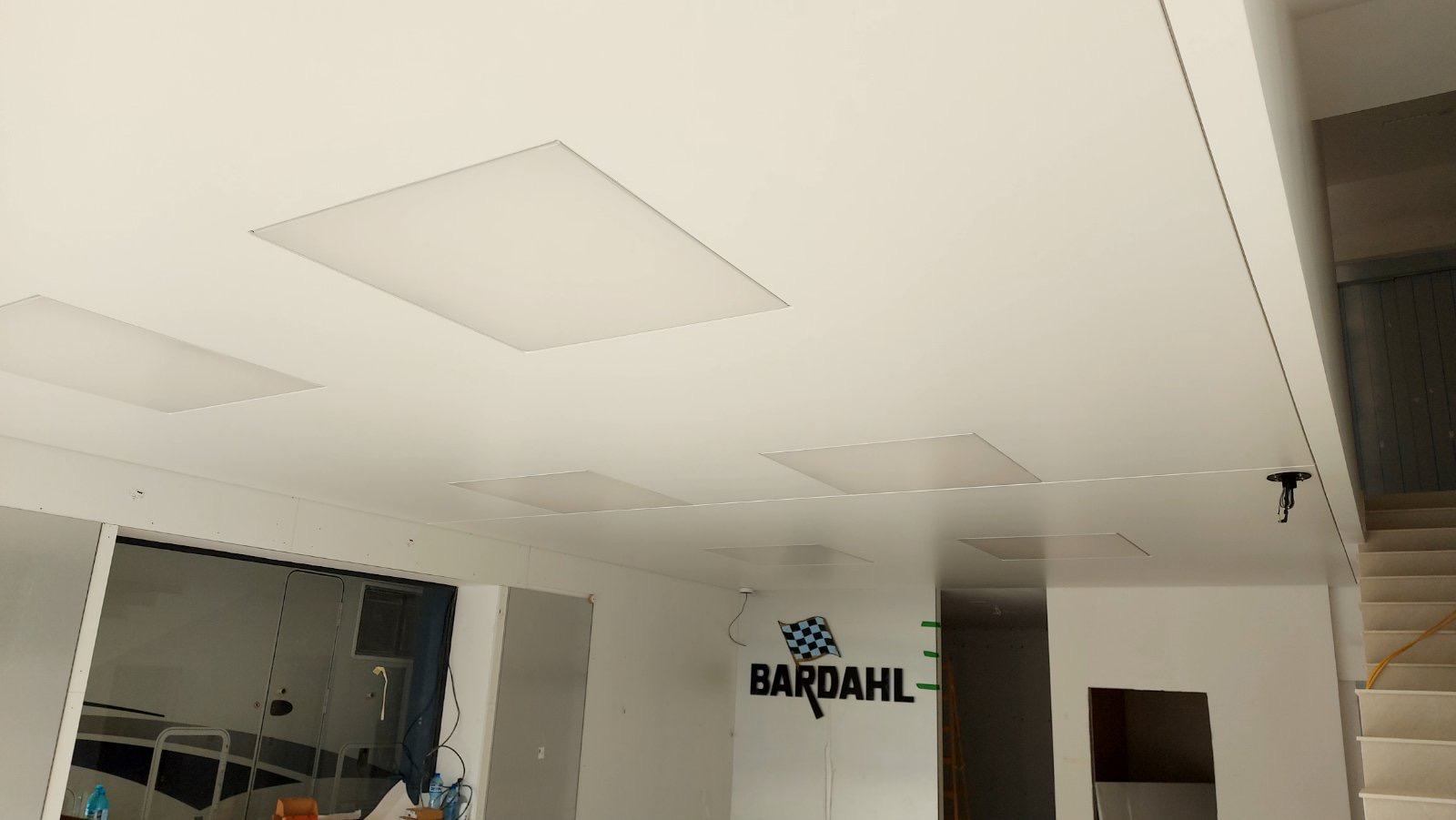 In one of our most recently completed projects, we installed white matt Barrisol foils as main ceiling and considering the future layout of the workspaces in the room, we created built-in lighting fixtures from translucent Barisol foils.